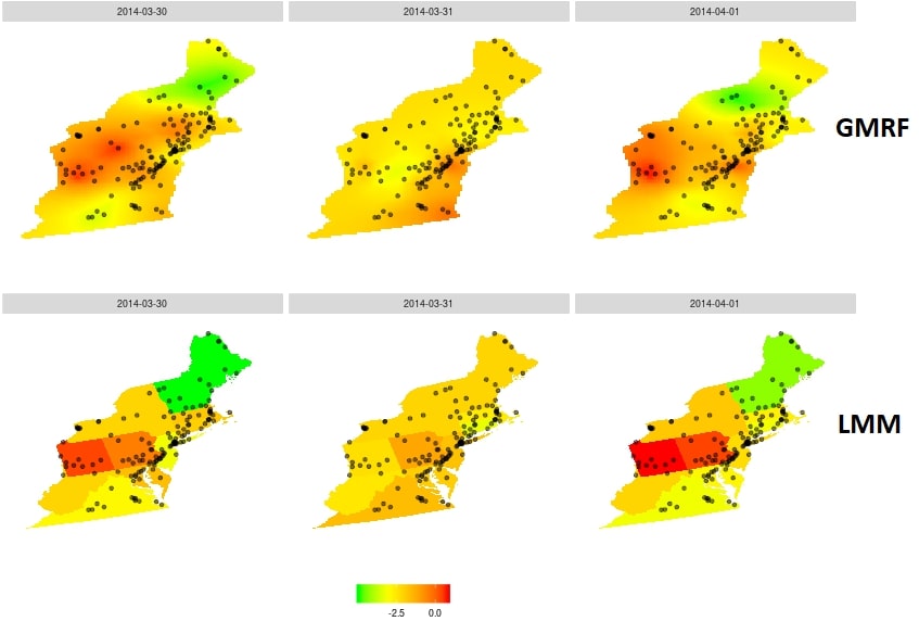 [3] Sarafian, Ron, et al. “Gaussian Markov Random Fields versus Linear Mixed Models for satellite-based PM2. 5 assessment: Evidence from the Northeastern USA.” Atmospheric Environment (2019).